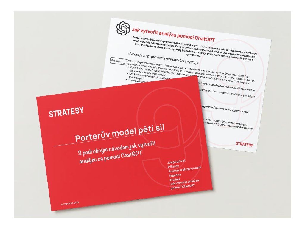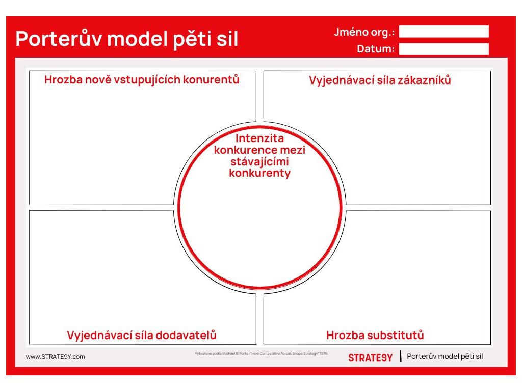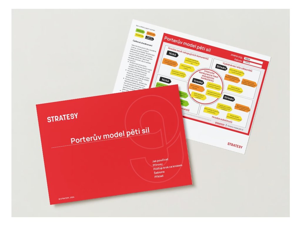 Získáte přehlednou šablonu, návod krok za krokem a ukázkový příklad, díky kterým zjistíte, odkud přichází největší tlak na váš nápad a kde má smysl hledat strategickou výhodu.